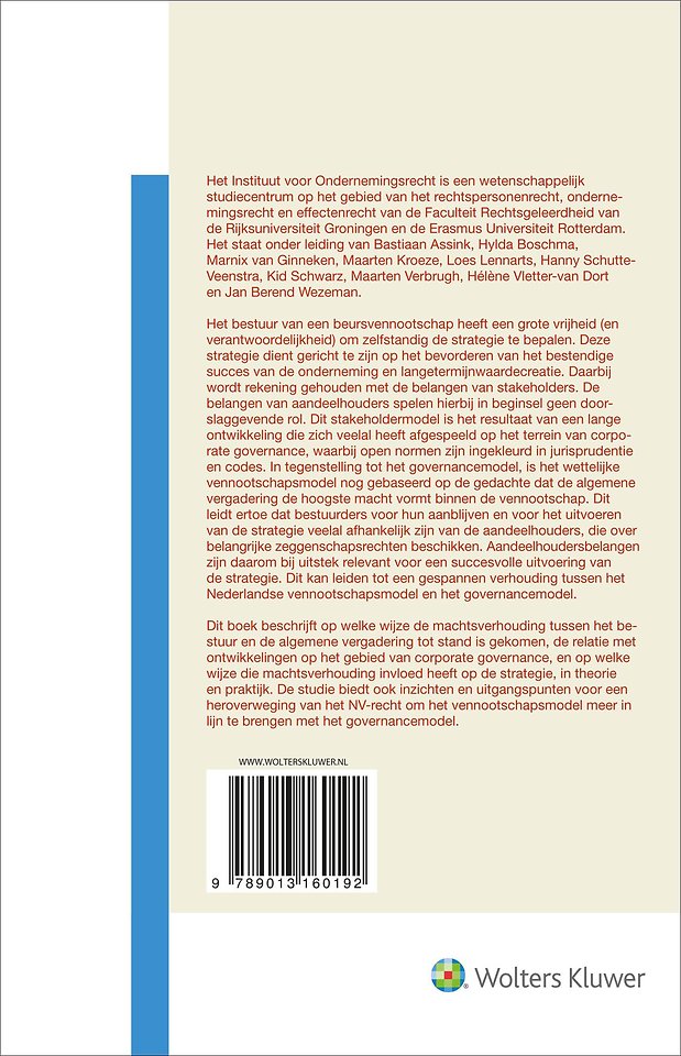 Het bestuur van een beursvennootschap heeft een grote vrijheid om zelfstandig de strategie te bepalen. De strategie dient gericht te zijn op het bevorderen van het bestendige succes van de onderneming en langetermijnwaardecreatie. De belangen van aandeelhouders spelen binnen het Nederlandse stakeholdersmodel in het beginsel geen doorslaggevende rol. Dit governancemodel verhoudt zich soms moeizaam met het wettelijke vennootschapsmodel uit 1929, dat is gebaseerd op de gedachte dat de algemene vergadering de hoogste macht vormt binnen de vennootschap. Dit leidt ertoe dat bestuurders van de beursvennootschap voor hun aanblijven en voor het uitvoeren van de strategie veelal afhankelijk zijn van de wensen van aandeelhouders. De beursvennootschap, corporate governance en strategie verkent de bovenstaande verhouding tussen het Nederlandse vennootschapsmodel en het governancemodel.