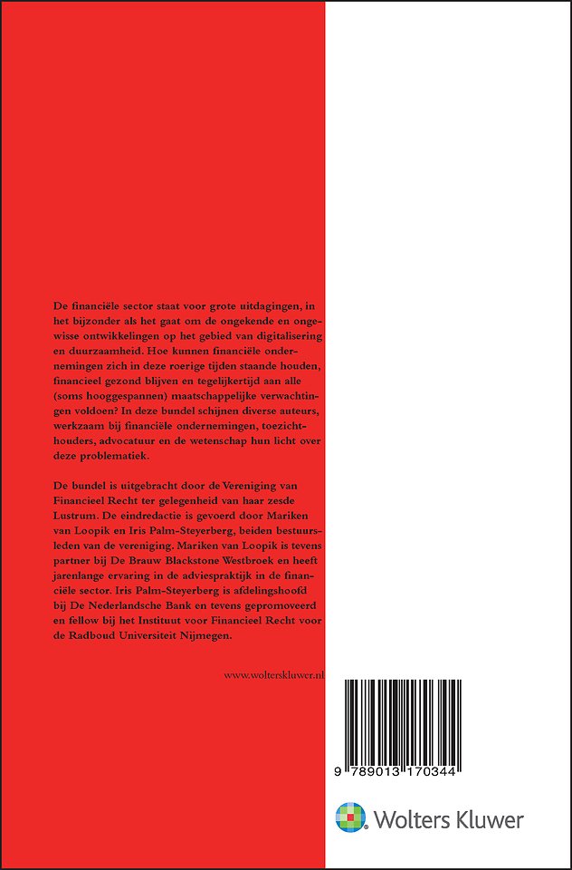 In deze bundel schijnen diverse experts – werkzaam bij financiële ondernemingen, toezichthouders, in de advocatuur of in de wetenschap – hun licht op digitalisering binnen en verduurzaming van de financiële sector. Het samenbrengen van die verschillende perspectieven maakt deze titel een veelomvattend, compleet en actueel werk, dat een mooi overzicht geeft van deze complexe materie.