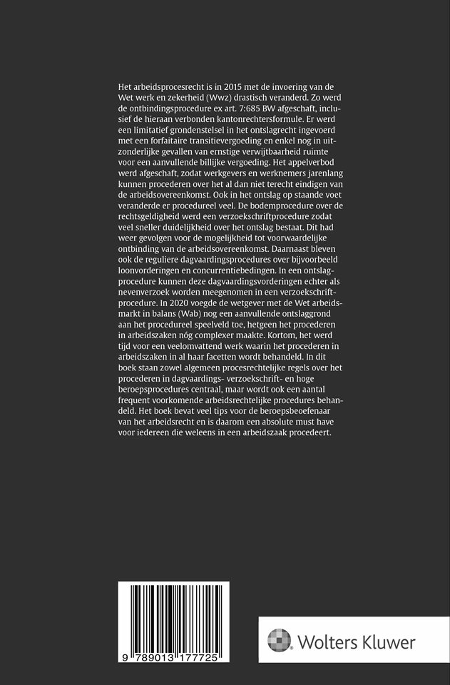 Sinds de wijzigingen in het ontslagrecht in 2015 is procederen in arbeidszaken bijzonder complex geworden. Daarnaast wordt er steeds minder vaak geprocedeerd, zodat de ervaring met procederen kleiner wordt. Het gevolg hiervan is dat in de praktijk frequent procedurele fouten worden gemaakt. Dit boek beoogt hierbij handvatten te bieden.