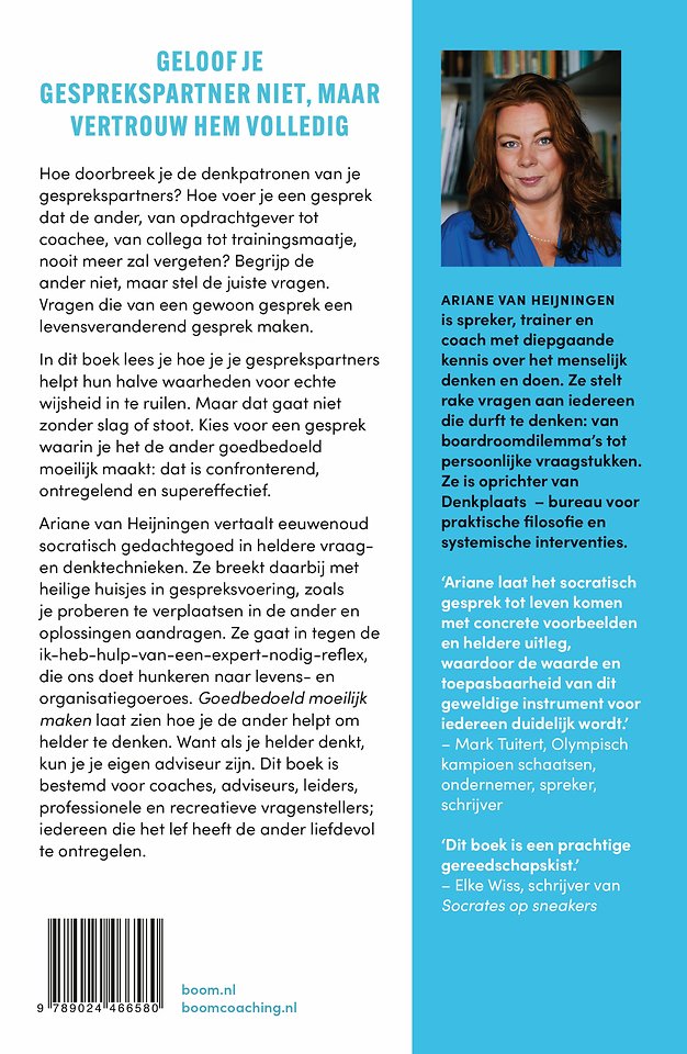 Ariane laat het socratisch gesprek tot leven komen met concrete voorbeelden en heldere uitleg, waardoor de waarde en toepasbaarheid van dit geweldige instrument voor iedereen duidelijk wordt. – Mark Tuitert, Olympisch kampioen schaatsen, ondernemer, spreker, schrijver