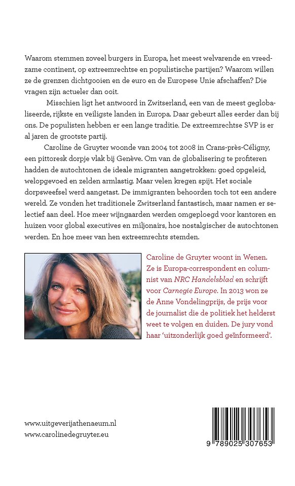 Waarom stemmen zoveel burgers in Europa, het meestwelvarende en vreedzame continent, op extreemrechtseen populistische partijen? Waarom willen ze de grenzendichtgooien en de euro en de Europese Unie afschaffen?Die vragen zijn actueler dan ooit.Misschien ligt het antwoord in Zwitserland, een van demeest geglobaliseerde, rijkste en veiligste landen in Europa.Daar gebeurt alles eerder dan bij ons. De populisten hebbener een lange traditie. De extreemrechtse svp/udc is er aljaren de grootste partij.Caroline de Gruyter woonde van 2004 tot 2008 in Cransprès-Céligny, een pittoresk dorpje vlak bij Genève. Omvan de globalisering te profiteren hadden de autochtonende ideale migranten aangetrokken: goed opgeleid, welopgevoeden zelden armlastig. Maar velen kregen spijt.Het sociale dorpsweefsel werd aangetast. De immigrantenbehoorden toch tot een andere wereld. Ze vonden hettraditionele Zwitserland fantastisch, maar namen er selectiefaan deel. Hoe meer wijngaarden werden omgeploegdvoor kantoren en huizen voor global executives en miljonairs,hoe nostalgischer de autochtonen werden. En hoemeer van hen extreemrechts stemden.