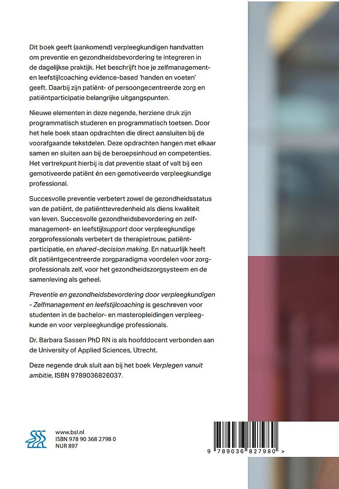 Door het hele boek staan opdrachten die direct aansluiten bij de voorafgaande tekstdelen. Deze opdrachten hangen met elkaar samen en sluiten aan bij de beroepsinhoud en competenties. Het vertrekpunt hierbij is dat preventie staat of valt bij een gemotiveerde patiënt én een gemotiveerde verpleegkundige professional.Succesvolle preventie verbetert zowel de gezondheidsstatus van de patiënt, de patiënttevredenheid als diens kwaliteit van leven. Succesvolle gezondheidsbevordering en zelfmanagement- en leefstijlsupport door verpleegkundige zorgprofessionals verbetert de therapietrouw, patiëntparticipatie, en shared-decision making. En natuurlijk heeft dit patiëntgecentreerde zorgparadigma voordelen voor zorgprofessionals zelf, voor het gezondheidszorgsysteem en de samenleving als geheel.Preventie en gezondheidsbevordering door verpleegkundigen - Zelfmanagement en leefstijlcoaching is geschreven voor studenten in de bachelor- en masteropleidingen verpleegkunde en voor verpleegkundige professionals.Dr. Barbara Sassen PhD RN is als hoofddocent verbonden aan de University of Applied Sciences, Utrecht.