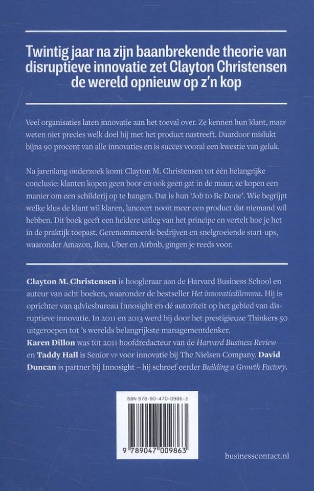 Na jarenlang onderzoek komt Clayton Christensen, professor aan de befaamde Harvard Business School en dé autoriteit op het gebied van innovatie, tot één belangrijke conclusie: wat ons al heel lang is geleerd – dat het begrijpen van de klant cruciaal is voor innovatie – klopt niet. Klanten kopen geen boor, maar een gat in de muur. Sterker nog, ze kopen een oplossing om een schilderij op te hangen. Je moet niet de klant zelf kennen, maar precies weten welk probleem hij of zij wil oplossen. Anders zijn innovatiepogingen bij voorbaat gedoemd te mislukken.