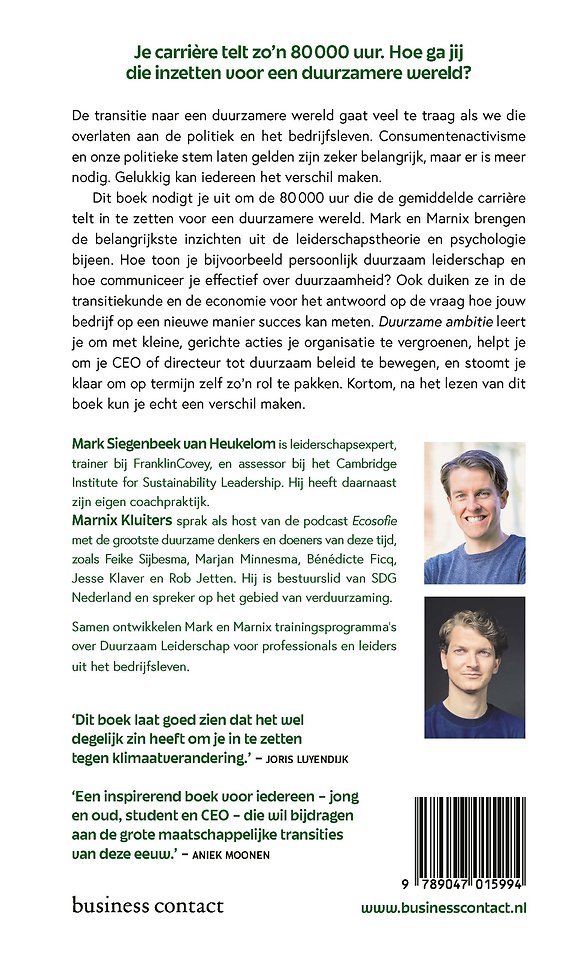 Dit boek nodigt je uit om de 80.000 uur die je carrière telt in te zetten voor een duurzamere wereld. Leer van leiderschapsexperts, psychologen, ecologen, transitiekundigen en economen welke rol je op welk moment kunt spelen in de duurzaamheidstransitie die elke organisatie raakt. Stoom jezelf klaar om de CEO of directeur van jouw organisatie te beïnvloeden naar meer duurzaamheid of om op termijn zelf die rol te pakken en echt impact te maken.