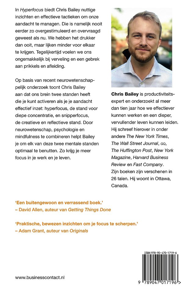 Door neurowetenschap, psychologie en mindfulness te combineren helpt Bailey je om elk van deze twee mentale standen optimaal te benutten. Zo krijg je meer focus in werk en leven. In ‘Hyperfocus’ biedt productiviteitsexpert Chris Bailey nuttige inzichten en effectieve tactieken, op basis van recent neurowetenschappelijk onderzoek, om onze aandacht te managen. Die is namelijk nooit eerder zo overgestimuleerd en overvraagd geweest als nu.