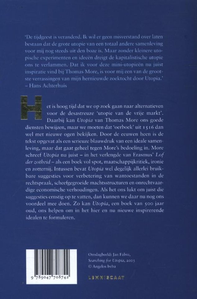 Het is hoog tijd dat we op zoek gaan naar alternatieven voor de desastreuze 'utopie van de vrije markt'. Daarbij kan Utopia van Thomas More ons goede diensten bewijzen, maar we moeten dat 'oerboek' uit 1516 dan wel met nieuwe ogen bekijken. Door de eeuwen heen is de tekst opgevat als een serieuze blauwdruk van een ideale samenleving, maar dat gaat geheel tegen More's bedoeling in. More schreef Utopia nu juist - in het verlengde van Erasmus' Lof der zotheid - als een boek vol spot, maatschappijkritiek, ironie en zotternij. Intussen bevat Utopia wel degelijk allerlei bruikbare suggesties voor verbetering van wantoestanden in de rechtspraak, van scheefgegroeide machtsstructuren en onrechtvaardige economische verhoudingen. Als het ons lukt om juist die suggesties ernstig op te vatten, dan kunnen we daar nu nog ons voordeel mee doen. Zo kan Utopia, een boek van 500 jaar oud, ons helpen om in het hier en nu nieuwe inspirerende idealen te formuleren.