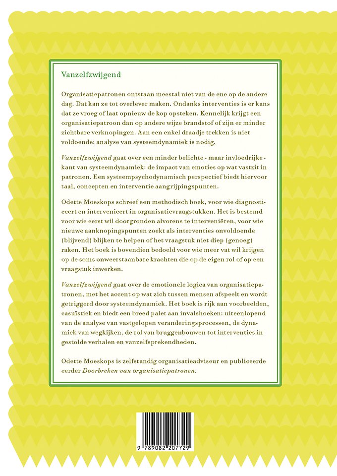 'Vanzelfzwijgend' gaat over een minder belichte - maar invloedrijke - kant van systeemdynamiek: de impact van emoties op wat vastzit in patronen. Een systeempsychodynamisch perspectief biedt hiervoor taal, concepten en interventie aangrijpingspunten. Odette Moeskops schreef een methodisch boek, voor wie diagnosticeert en intervenieert in organisatievraagstukken. Het is bestemd voor wie eerst wil doorgronden alvorens te interveniëren, voor wie nieuwe aanknopingspunten zoekt als interventies onvoldoende (blijvend) blijken te helpen of het vraagstuk niet diep (genoeg) raken. Het boek is bovendien bedoeld voor wie meer vat wil krijgen op de soms onweerstaanbare krachten die op de eigen rol of op een vraagstuk inwerken.