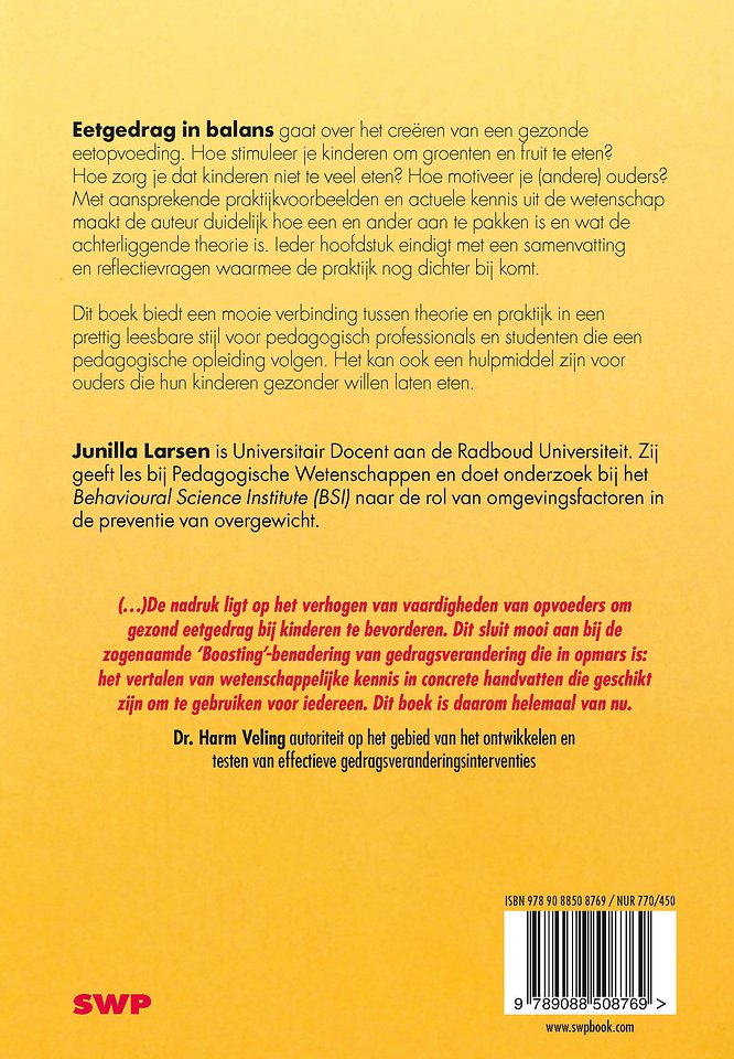 Dit boek biedt een mooie verbinding tussen theorie en praktijk in een prettig leesbare stijl voor pedagogisch professionals en studenten die een pedagogische opleiding volgen. Het kan ook een hulpmiddel zijn voor ouders die hun kinderen gezonder willen laten eten.