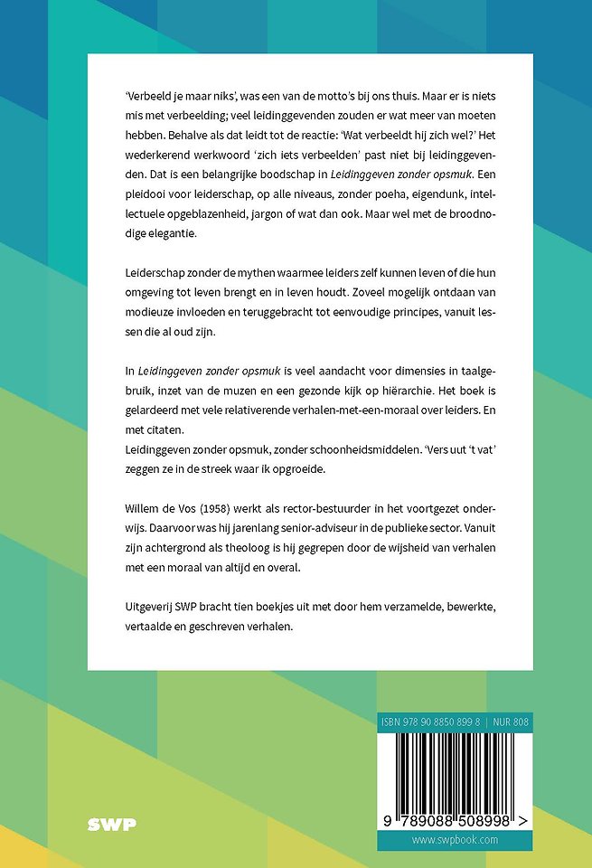 ‘Verbeeld je maar niks’, was een van de motto’s bij ons thuis. Maar met verbeelding is niets mis; ze zou veel leidinggevende gegeven moeten zijn. Behalve als het leidt tot de reactie: ‘Wat verbeeldt hij zich wel?’ Het wederkerend werkwoord ‘zich iets verbeelden’ past niet bij leidinggevenden. Dat is een belangrijke boodschap in Leidinggeven zonder opsmuk. Een pleidooi voor leiderschap, op alle niveaus, zonder poeha, eigendunk, intellectuele opgeblazenheid, jargon of wat dan ook. Met de broodnodige elegantie.