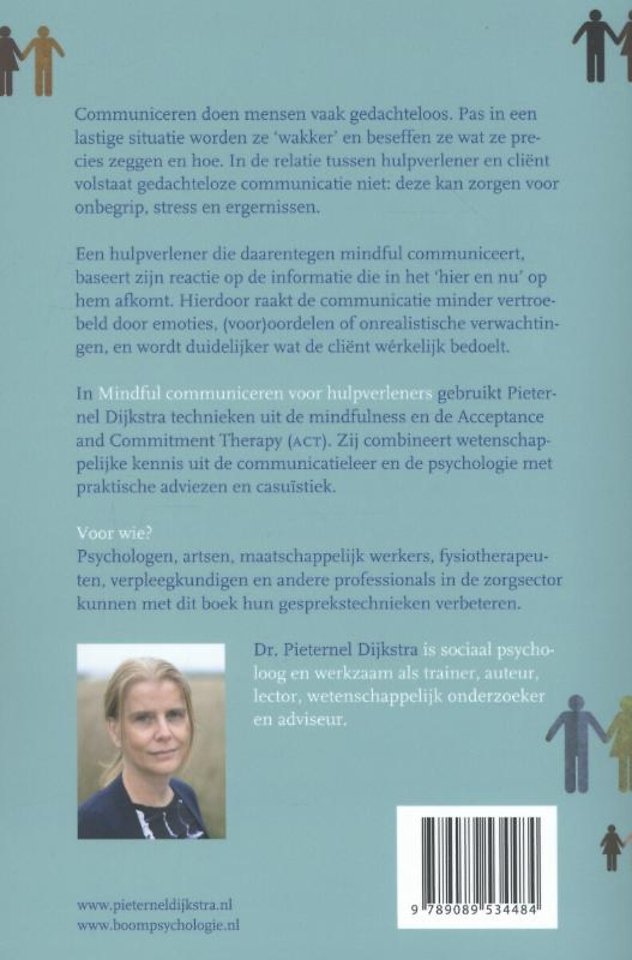 Pieternel Dijkstra laat in 'Mindful communiceren voor hulpverleners' zien hoe je met aandacht kunt communiceren. Hiervoor gebruikt zij technieken uit de mindfulness en de Acceptance and Commitment Therapy (ACT). Dijkstra combineert wetenschappelijke kennis uit de communicatieleer en de psychologie met praktische adviezen en casuïstiek.