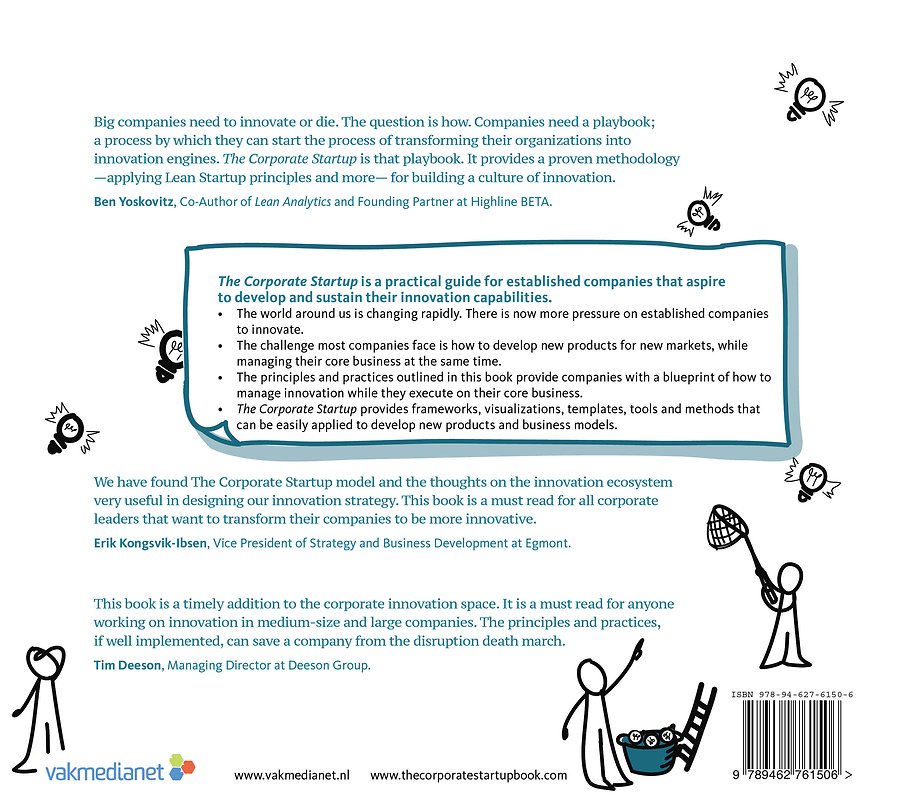 'Het Corporate Startup-model en de ideeën over het innovatie-ecosysteem zijn voor ons zeer nuttig gebleken bij het ontwerpen van onze eigen innovatiestrategie. Dit boek is een must voor alle leiders die hun bedrijf willen transformeren om innovatiever te kunnen zijn.' - Erik Kongsvik-Ibsen, vicepresident strategy en business development van Egmont