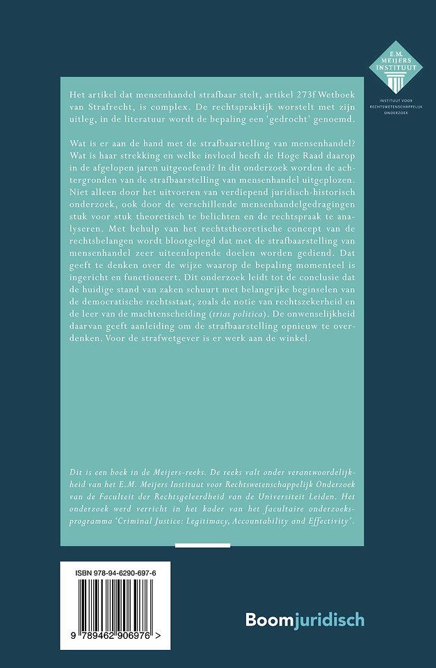 In dit onderzoek worden de achtergronden van de strafbaarstelling van mensenhandel uitgeplozen. Niet alleen door het uitvoeren van verdiepend juridisch-historisch onderzoek, ook door de verschillende mensenhandelgedragingen stuk voor stuk theoretisch te belichten en de rechtspraak te analyseren. Met behulp van het rechtstheoretische concept van de rechtsbelangen wordt blootgelegd dat met de strafbaarstelling van mensenhandel zeer uiteenlopende doelen worden gediend. Dat geeft te denken over de wijze waarop de bepaling momenteel is ingericht en functioneert.
