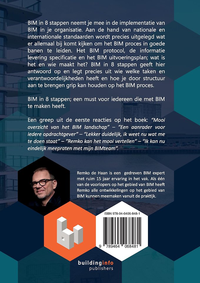 BIM in 8 stappen neemt je mee in de implementatie van BIM in je organisatie. Aan de hand van nationale en internationale standaarden wordt precies uitgelegd wat er allemaal bij komt kijken om het BIM proces in goede banen te leiden. Het BIM protocol, de informatie levering specificatie en het BIM uitvoeringsplan; wat is het en wie maakt het? BIM in 8 stappen geeft hier antwoord op en legt precies uit wie welke taken en verantwoordelijkheden heeft en hoe je door structuur aan te brengen grip kan houden op het BIM proces.