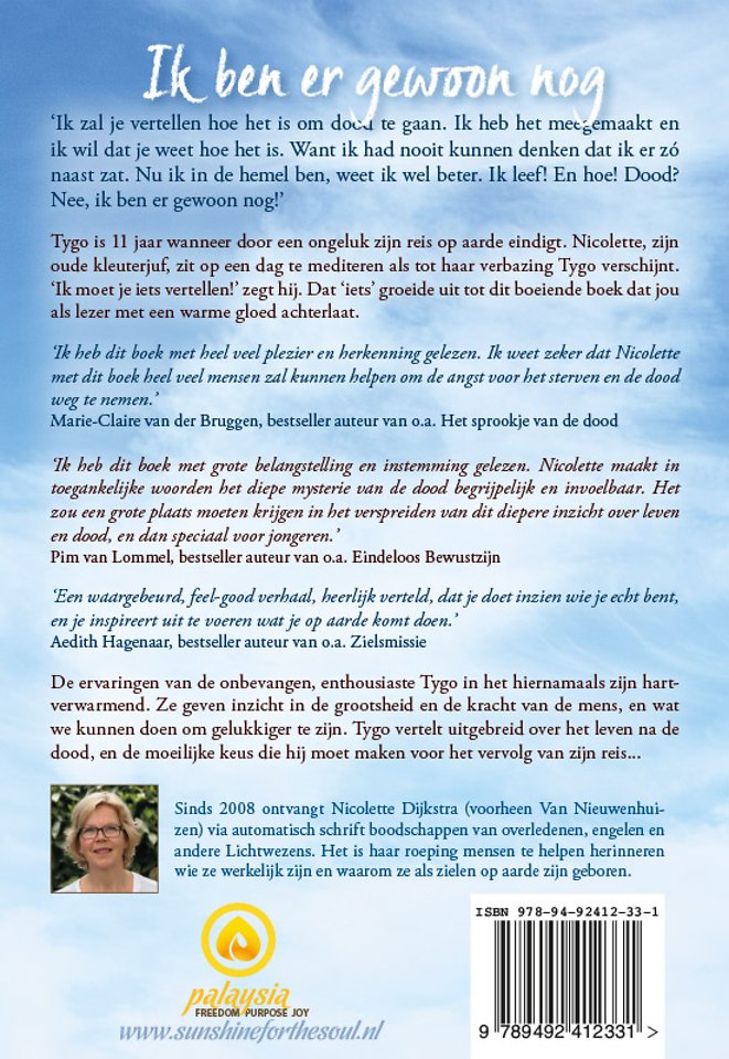 Tygo is 11 jaar wanneer door een ongeluk zijn reis op aarde eindigt. Nicolette, zijn oude kleuterjuf, zit op een dag te mediteren als tot haar verbazing Tygo verschijnt. ‘Ik moet je iets vertellen!’ zegt hij. Dat ‘iets’ groeide uit tot dit boeiende boek dat jou als lezer met een warme gloed achterlaat.