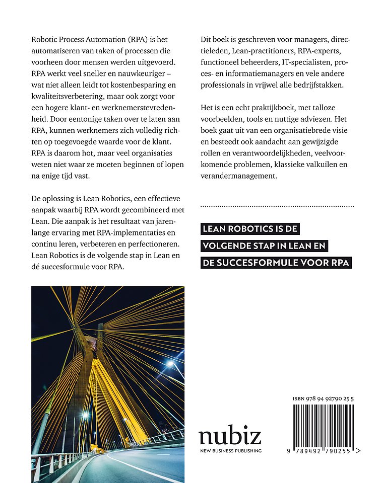 Dit boek introduceert een effectieve, op LEAN gebaseerde aanpak om te starten met robotics en RPA. Die aanpak is het resultaat van jarenlange ervaring met RPA-implementaties en continu leren, verbeteren en perfectioneren. Dit boek is geschreven voor directieleden, managers en professionals in ICT, informatiemanagement en automatisering. Het is een echt praktijkboek, met talloze voorbeelden, handvatten en nuttige adviezen.
