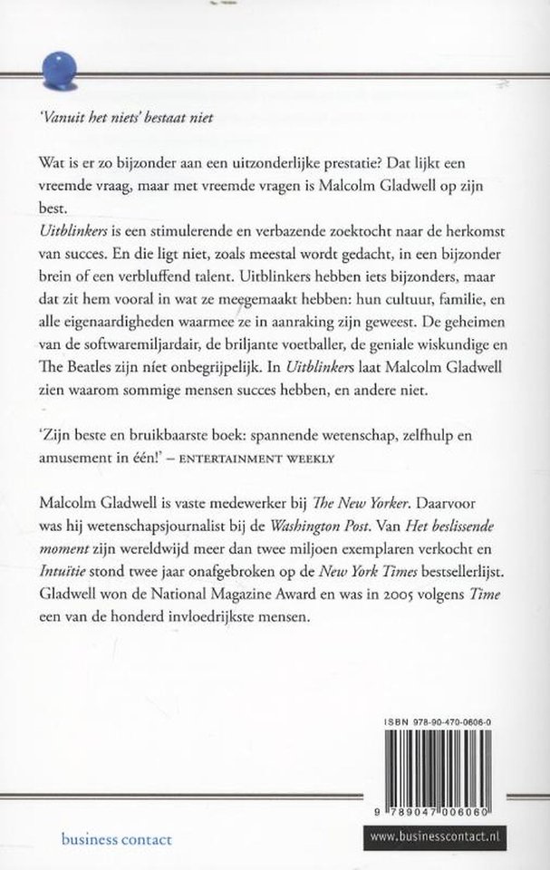 En die ligt niet, zoals meestal wordt gedacht, in een bijzonder brein of een verbluffend talent. Uitblinkers hebben iets bijzonders, maar dat zit hem vooral in wat ze meegemaakt hebben: hun cultuur, familie en alle eigenaardigheden waarmee ze in aanraking zijn geweest. En niet te vergeten: puur toeval, dom geluk.