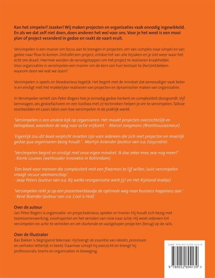 "Een boek voor mensen die complexiteit met een fileermes te lijf willen. Juist versimpelen vraagt secuur vakmanschap." - Jaap Peters (auteur van o.a. 'Bij welke reorganisatie werk jij?' en 'Het Rijnland-boekje')
