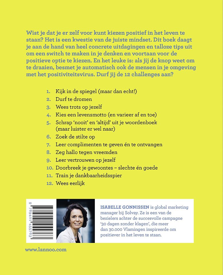 Wist je dat je er zelf voor kunt kiezen positief in het leven te staan? Het is een kwestie van de juiste mindset. Dit boek daagt je aan de hand van heel concrete uitdagingen en talloze tips uit om een switch te maken in je denken en voortaan voor de positieve optie te kiezen. En het leuke is: als jij de knop weet om te draaien, besmet je automatisch ook de mensen in je omgeving met het positiviteitsvirus. Durf jij de 12 challenges aan?
