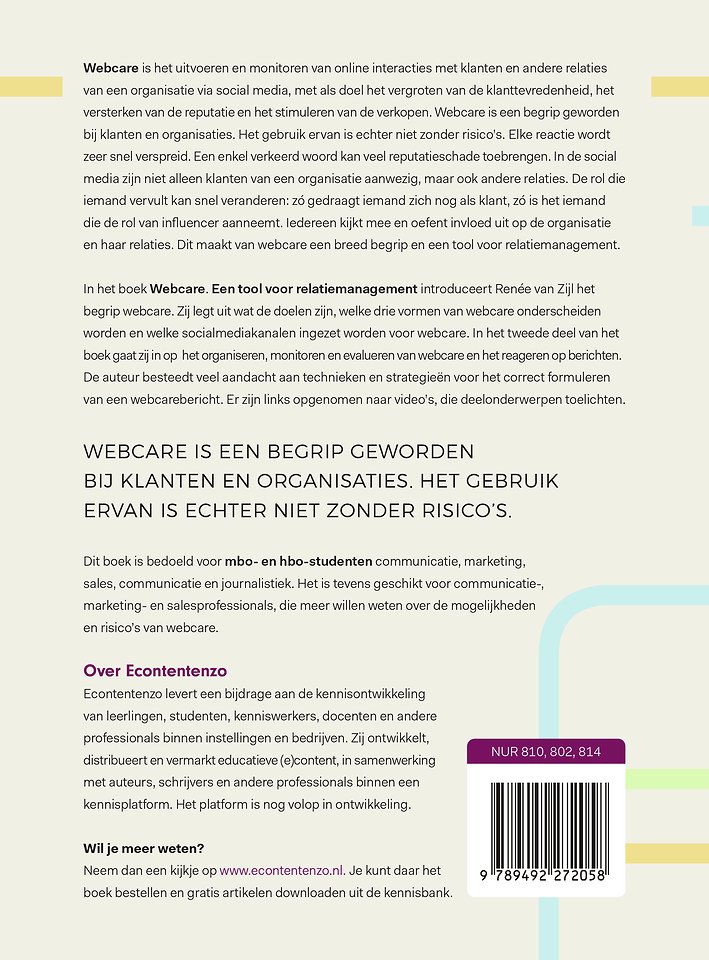Dit boek is bedoeld voor mbo- en hbo-studenten communicatie, marketing, sales, communicatie en journalistiek. Het is tevens geschikt voor communicatie-, marketing- en salesprofessionals, die meer willen weten over de mogelijkheden en risico’s van webcare.