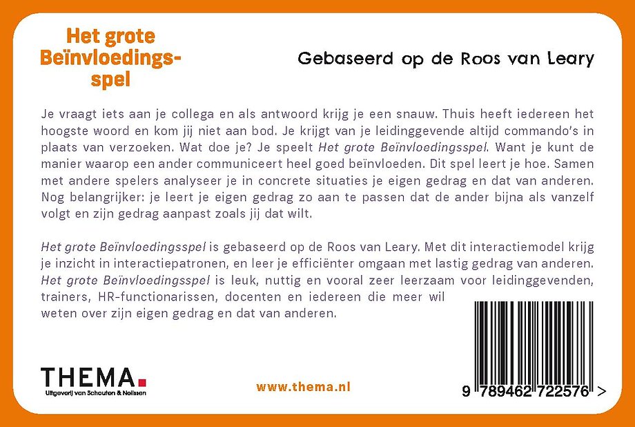 Het grote beïnvloedingsspel is gebaseerd op de Roos van Leary. Met dit interactiemodel krijg je inzicht in interactiepatronen en leer je efficiënter omgaan met lastig gedrag van anderen. In deze nieuwe editie van dit al jaren goed verkopende spel zorgen we dat je nóg effectiever de verschillende interactiepatronen herkent en kunt tackelen.